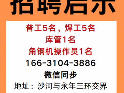 招聘启示:普工5名,焊工5名,库管1名,角钢机操作员1名,