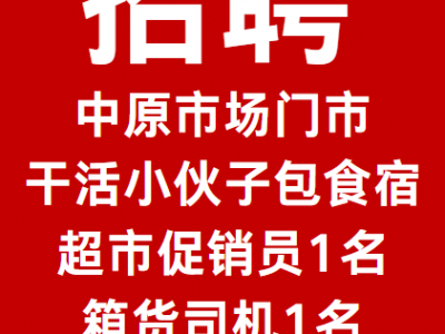 招聘中原市场门市干活小伙子包食宿,超市促销员1名,箱货司机1名