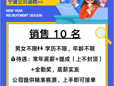 宁冀公司诚聘销售 10 名,常年底薪+提成(上不封顶)+全勤奖,底薪实发,公司提供精准客源,上手即可接单 。地址:产业城东区 22-111;