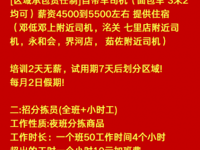 白班配送(早6点到中午12点工作半天)[区域承包责任制]自带车司机(面包车 3米2均可)薪资 4500到5500左右 提供住宿