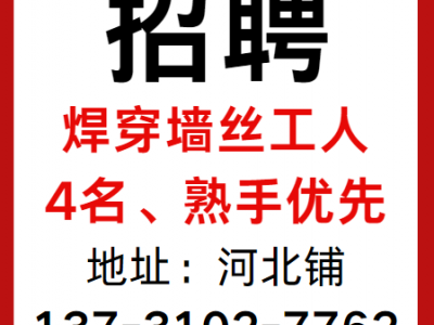 招聘:焊穿墙丝工人4名,熟手优先;