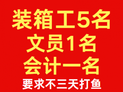 河北铺 招工: 装箱工5名、文员1名,会计一名