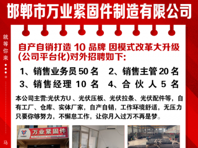 邯郸市万业紧固件制造有限公司:招聘电话销售人员50名,图纸深化2名,团队经理2名,会计一名,采购1名(采购要求悉光伏配件产品)没有任何套路+公休+高提成。8000-20000,具体面谈。公司不跳舞不画饼,实体厂家,非皮包公司,可来看厂,自产自销价格低,好成交客户,有专人组长带,工作氛围非常好。 工作地点:产业城东区2c-013(7号门)