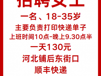 河北铺后东街口,顺丰快递招聘一名女工18-35岁的,主要负责打印快递单子,上班时间10点-到晚上9.30点半,一天130元