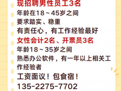 女性会计2名。开票员3名,年龄18~35岁之间。熟悉办公软件,有一年以上相关工作经验者。工资面议!包食宿!