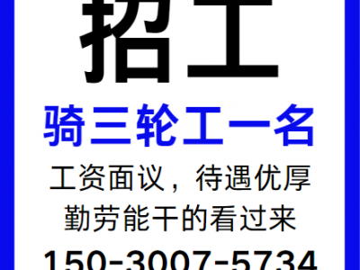 施庄工业区招骑三轮工一名,工资面议,待遇优厚,勤劳能干的看过来