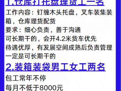 标准件厂招聘:1.仓库打托盘理货工一名,工作内容:钉缠木头托盘,叉车装集装箱,仓库理货配货。要求:细心负责,善于沟通,可长期干的,会开4.2米货车优先。待遇优厚,有发展空间成熟后负责管理。一定是可长期干的。2 招装箱装袋男工女工两名,包工常年不停,每月不低于8000元。
