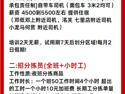 白班配送(早6点到中午12点工作半天)[区域承包责任制]自带车司机(面包车 3米2均可)薪资 4500到5500左右 提供住宿