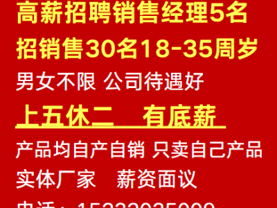 高薪招聘销售经理5名 招销售30名,18-35周岁(男女不限公司待遇好,上五休二有底薪产品均自产自销实体厂家薪资面议)只卖自己产品 电话:微信同号 地址:东洺阳村村南