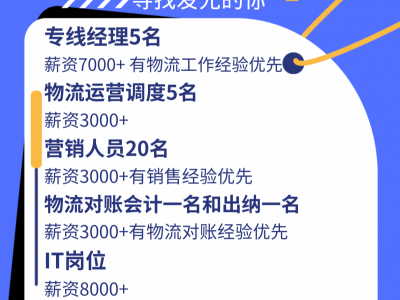 招聘专线经理5名薪资7000+ 有物流工作经验优先、物流运营调度5名薪资3000+、营销人员20名薪资3000+有销售经验优先、物流对账会计一名和出纳一名薪资3000+有物流对账经验优先;IT岗位薪资8000+招聘