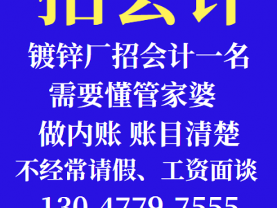 镀锌厂招会计一名 需要懂管家婆 做内账 账目清楚,不经常请假、工资面谈 13047797555。15531011875