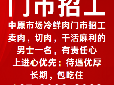 中原市场冷鲜肉门市招工,卖肉,切肉,干活麻利的男士一名,有责任心、上进心优先;待遇优厚,长期,包吃住。电话13730028329