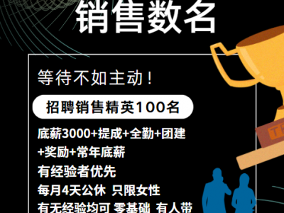 招销售精英100名,底薪3000+提成+全勤+团建+奖励