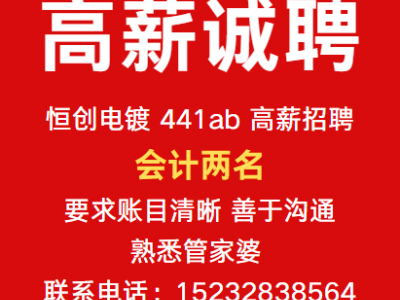 恒创电镀 441ab 高薪招聘会计两名, 要求账目清晰,善于沟通,熟悉管家婆 。