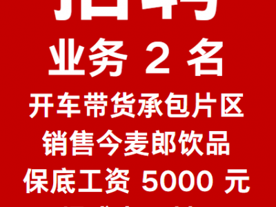 招聘业务 2 名,开车带货承包片区销售今麦郎饮品,保底工资 5000 元, 提成上不封顶。