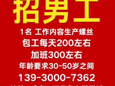 招男工1名 工作内容生产螺丝,包工每天200左右,加班300左右 年龄要求30-50岁之间,