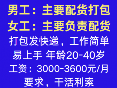 招女工:主要负责配货,打包发快递,工作简单易上手,年龄20-40岁,工资:3000-3600元/月,要求,干活利索,