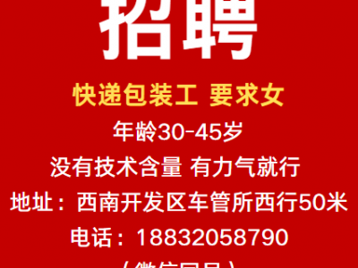 招聘快递包装工,要求女,年龄30到45岁。