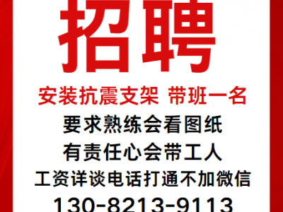 招聘 安装抗震支架 带班一名,要求熟练会看图纸,有责任心会带工人,工资详谈电话打通不加微信