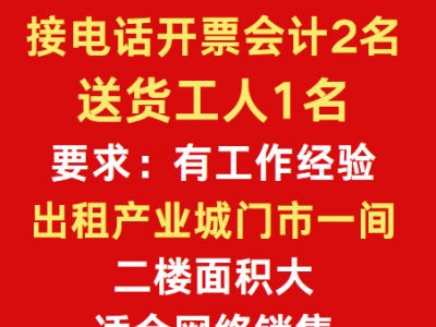 河北铺 招工:接电话开票会计2名。送货工人1名