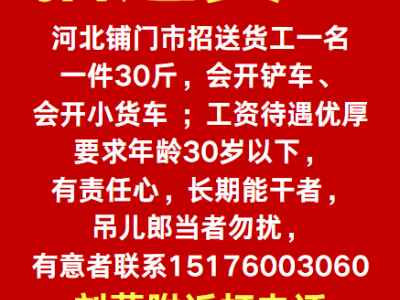 招工:河北铺门市招送货工一名,一件30斤,会开铲车、会开小货车 ;工资待遇优厚,要求年龄30岁以下,有责任心,长期能干者,吊儿郎当者勿扰,