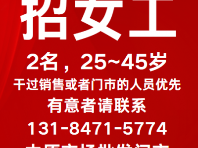 中原市场批发门市招女工2名,25~45岁,干过销售或者门市的人员优先,有意者请联系