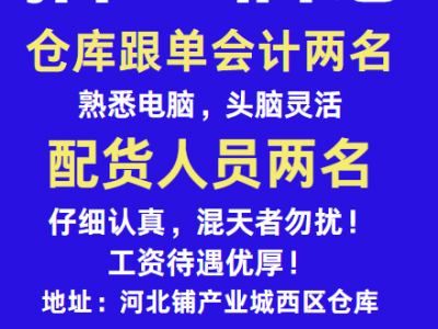 招工:仓库跟单会计两名,熟悉电脑,头脑灵活;配货人员两名,要求仔细认真,混天者勿扰!工资待遇优厚!