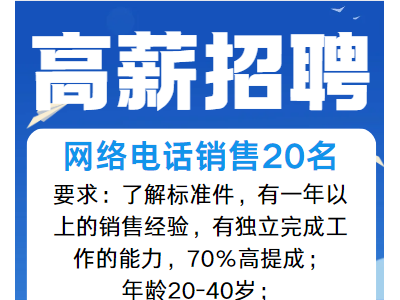 要求:了解标准件,有一年以上的销售经验,有独立完成工作的能力,70%高提成;