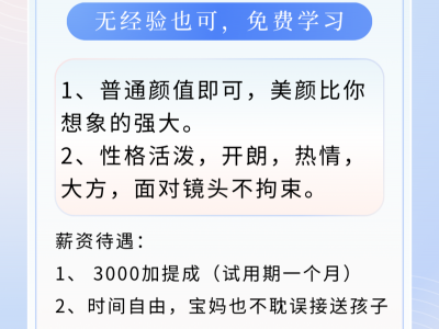 招娱乐主播, 3000加提成(试用期一个月)时间自由,宝妈也不耽误接送孩子。无经验也可,免费学习
