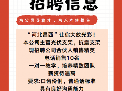 为公司寻将才,为人才找舞台。“河北昌西”让你大放光彩!本公司主营光伏支架,抗震支架,现招聘公司合伙人销售精英,电话销售10名。一对一教学,培养精致团队,薪资待遇高。