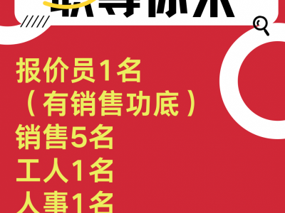 招聘报价员1名(有销售功底)销售5名,工人1名,人事1名,工资稳定,待遇高,每月15号开工资