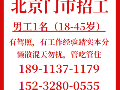 北京门市招男工1名(18-45岁)有驾照,,要求:有工作经验踏实本分,懒散混天勿扰,管吃管住。