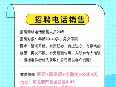 招聘电话销售20名 招聘对象:年龄20-40,男女不限 要求:活泼开朗,责任心,有上进心,挣钱的欲望 男女不限,有无经验均可,入职有专人培训! 待遇:底薪+高提成+奖金+公休 公司提供客户资源