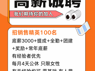 招销售精英100名,底薪3000+提成+全勤+团建+奖励