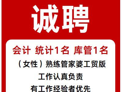 诚聘会计:统计1名、库管1名,(女性)熟练管家婆工贸版