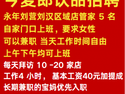 永年刘营刘汉区域店管家 5 名,自家门口上班,要求女性可以 兼职。当天工作时间自由,上午下午均可上班。
