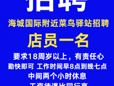 海城国际附近菜鸟驿站招聘店员一名,要求18周岁以上,有责任心勤快即可 工作时间早8点到晚七点 中间两个小时休息 工资待遇比同行高 联系电话13931077891