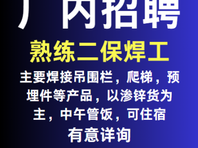 厂内招聘熟练二保焊工,主要焊接吊围栏,爬梯,预埋件等产品,以渗锌货为主,中午管饭,可住宿,有意详询