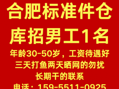 合肥标准件仓库招男工1名,年龄30-50岁,工资待遇好,三天打鱼两天晒网的勿扰,长期干的联系