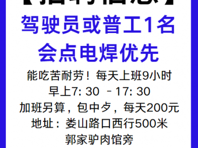 招聘:驾驶员或普工1名,会点电焊优先!能吃苦耐劳!每天上班9小时,早上7: 30 -17: 30,加班另算。包中歺,每天200元,地址:娄山路口西行500米郭家驴肉馆旁