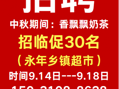 中秋期间:香飘飘奶茶招临促30名:(永年乡镇超市)时间9.14日---9.18日,联系电话:15031088628