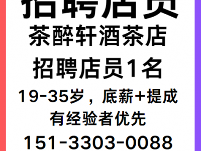 茶醉轩酒茶店招聘店员1名,19-35岁,底薪+提成,有经验者优先,