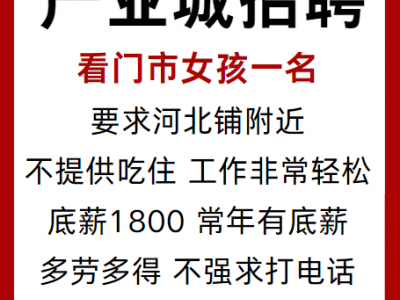 产业城招聘看门市女孩一名,要求河北铺附近。不提供吃住工作非常轻松,底薪1800,常年有底薪。多劳多得。不强求打电话