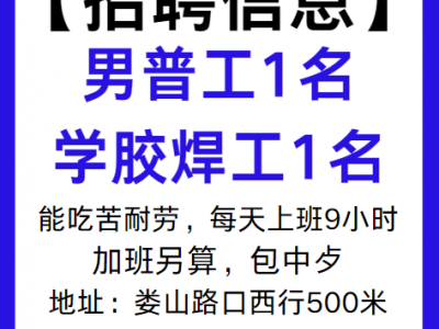 招聘:男普工1名,学胶焊干1名,能吃苦耐劳!每天工作9小时,加班另算,包中歺,地址:娄山路口西行500米,联系电话:13957088097