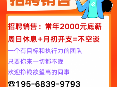 招聘销售:常年2000元底薪+周日休息+月初开支=不空谈。