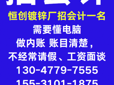 恒创镀锌厂招会计一名,需要懂电脑,做内账 账目清楚,不经常请假、工资面谈, 电话:13047797555 15531011875