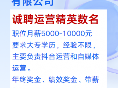 职位月薪5000-10000元,要求大专学历,经验不限,主要负责抖音运营和自媒体运营。