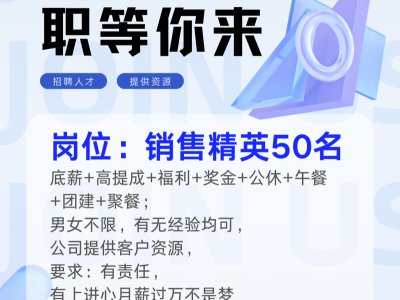 招聘销售精英50名,底薪+高提成+福利+奖金+公休+午餐+团建+聚餐;