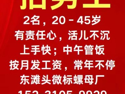 招工:招男工2名,20-45岁,有责任心,活儿不沉,上手快;中午管饭,按月发工资,常年不停。
