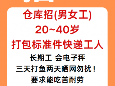 仓库招(男女工)20~40岁,打包标准件快递工人,长期工,会电子秤,三天打鱼两天晒网勿扰!要求能吃苦耐劳。工作稳定,常年有活。